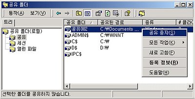 [시작] →[제어판] →[관리도구] →[컴퓨터관리]창의 공유 폴더 부분을 클릭하면 [공유 폴더] 창을 볼 수 있습니다.