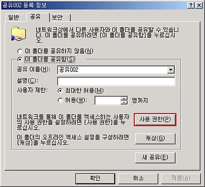 공유 등록 정보 창 안에 있는 버튼을 누르게 되면 아래와 같이 공유 사용권한 창이 나옵니다.