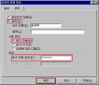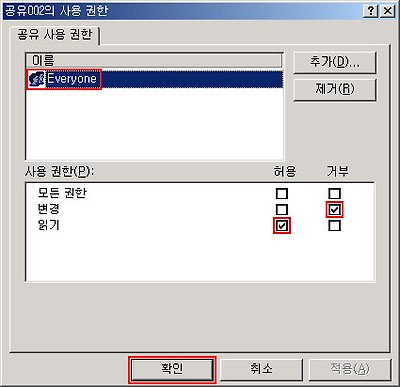 공유폴더의 사용권한을 위와 같이 설정합니다. 풀어 설명하면 읽기는 가능하나 변경/수정은 불가능하다는 의미입니다. 이렇게 설정한 다음 버튼을 눌러 빠져 나옵니다.