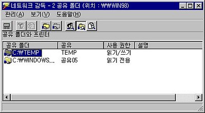 Win98 혹은 Win9X 버전의 Windows일 경우 fsmgmt.msc가 없습니다. 이럴 경우 [시작] →[실행]창에서 netwatch라고 입력합니다.