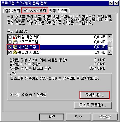 [시작] →[설정] →[제어판] →[프로그램 추가/제거]를 눌러 나오는 [프로그램 추가/제거 등록정보] 창에서 [Windows 설치] 탭을 누르면 아래와 같은 창이 나옵니다.