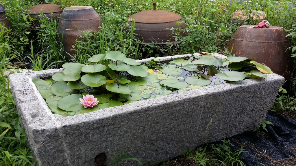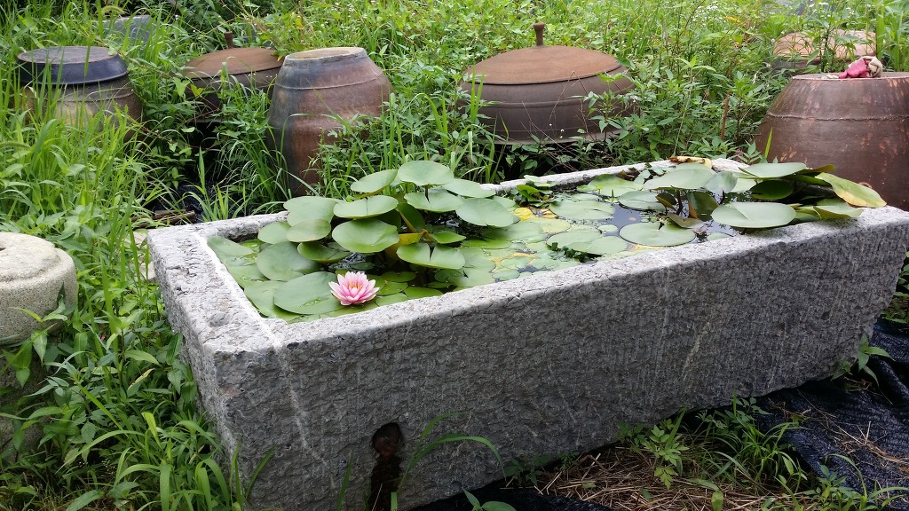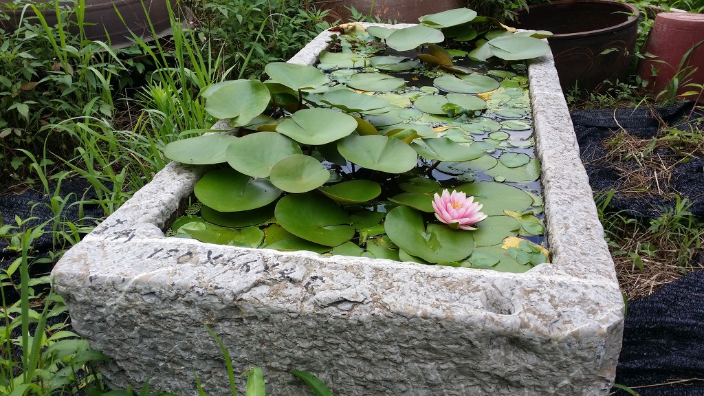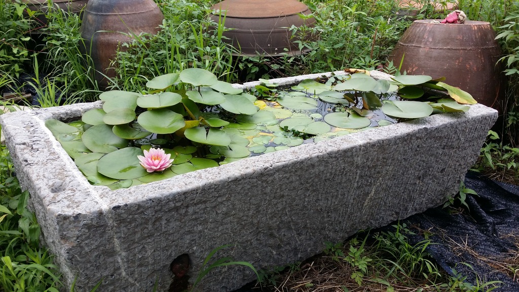 정원꾸미기에 사용하실수 있는 대형 사각 청석재질의 사각구시로 아래와 같이 연꽃이나 수련을 키우시면 멋진 정원 조경용품이 되지요
