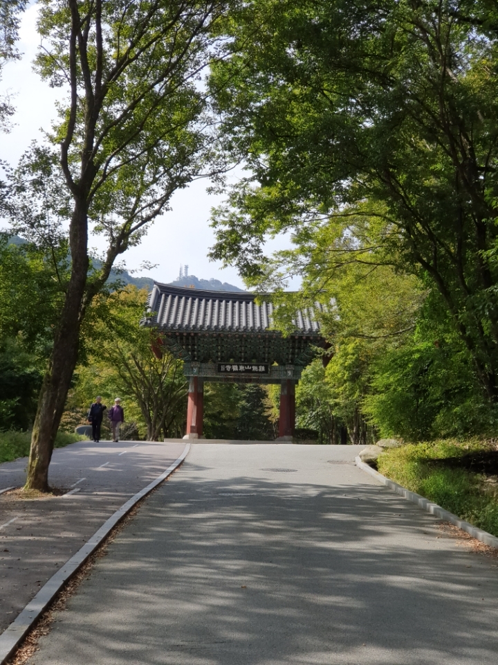 일주문 지붕 위로는 절묘하게 천왕봉이 보이고 도로에는 젊잖으신 노부부가 하산하는 모습이 보기에 참 아름답다.