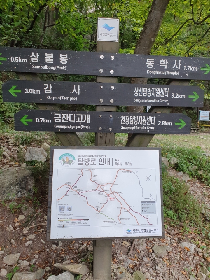 새해 연초부터 2020년 가을에는 계룡산 종주를 꼭 해보고 싶다는 생각을 하며 늘 관심을 갖고 준비하고 있던 중 추석연휴라 마음도 가볍게 등산계획을 결행하게 되었다. 김밥 두 줄과 생수 두 병을 배낭에 담았다. 유성온천역 5번 정류장에서 107번 시내버스를 탑승하여 11시 20분경 동학사 주차장에 하차하니 평일이라 등산하는 인적이 없어서 참으로 한산하였다. 그러나 나는 시내버스를 타고 어느 때나 계룡산에 자유롭게 접근할 수 있는 대전시민만 느낄 수 있는 여유로움을 즐기기로 작정하였다.