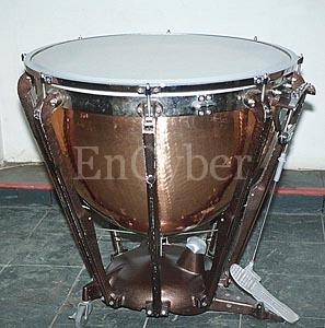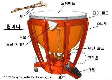 관현악에서 중요한 위치를 차지하는 악기로 반구 모양의 통에 한 장의 피막(皮膜)을 친 것으로, 음고를 판별할 수 있는 소리가 난다. 통으로는 구리가 많이 쓰이며 크기에는 규정이 없으나 막면 지름이 56∼80cm가 보통이다. 2개가 한 쌍을 이루며 3개 이상을 사용하는 경우도 있다. 막은 헤드라고 하며 송아지의 등가죽이 가장 좋다. 화학합성막도 쓰이는데, 전자에 비해 음질이 떨어진다고는 하지만 튼튼하고 습기의 영향을 받지 않는 것이 특징이다. 막의 장력(張力)을 연주자가 조정해서 조율하는데 대체로 5도의 범위에서 변화시킬 수 있다.