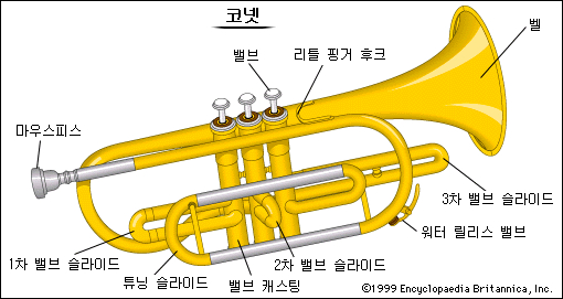 놋쇠로 만든 악기로 피스톤에 의한 관장(管長)변화장치가 달려 있으며 모양이 트럼펫과 흡사하고 음색도 비슷하다. 트럼펫과 같은 화려함은 없으나 친밀감이 가는 음질을 지녔으며 초보자가 다루기는 트럼펫보다 쉽다. 연주기법의 경쾌함으로 오랜 역사를 가진 트럼펫의 자리를 빼앗아 19세기 후반부터 제1차 세계대전 후 새로운 형의 트럼펫이 나타날 때까지 약 반 세기 동안에 걸쳐 널리 애용되었다. L.H.베를리오즈, G.비제, G.로시니, I.F.스트라빈스키 등은 이 악기를 위한 작품을 많이 남겼다.