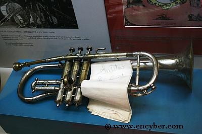 미국 루이지애나주 뉴올리언스 재즈박물관. 루이 암스트롱이 사용하던 코넷. 그는 어린시절 코넷을 배우면서 음악을 접하게 되었다. 재즈박물관에