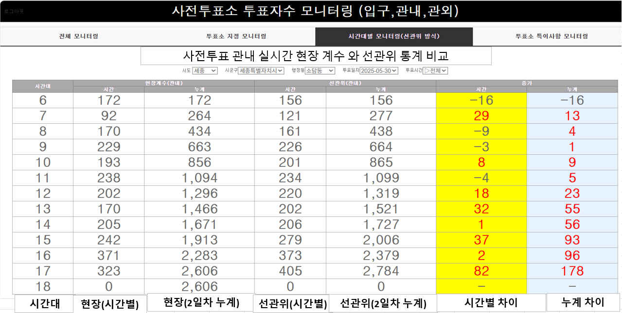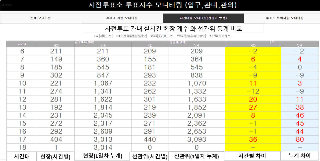 아래 이미지는 세종시 소담동의 2일차 집계 데이터와 선관위 통계 데이터의 비교 표이다.