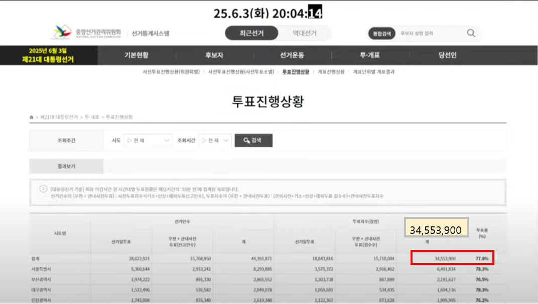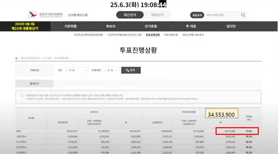 또 정지 19시 08분 34,553,900 투표율 77.8%