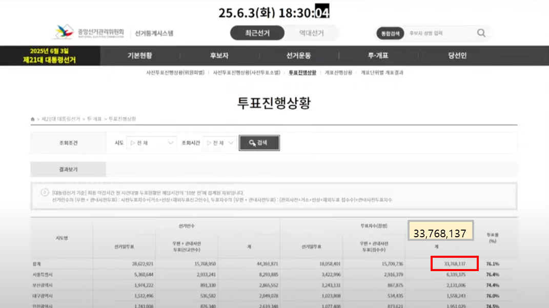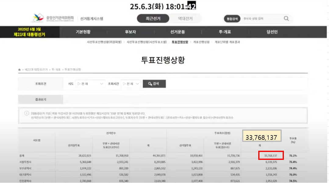 또 정지 18시 01분 33,768,137 투표율 76.1%