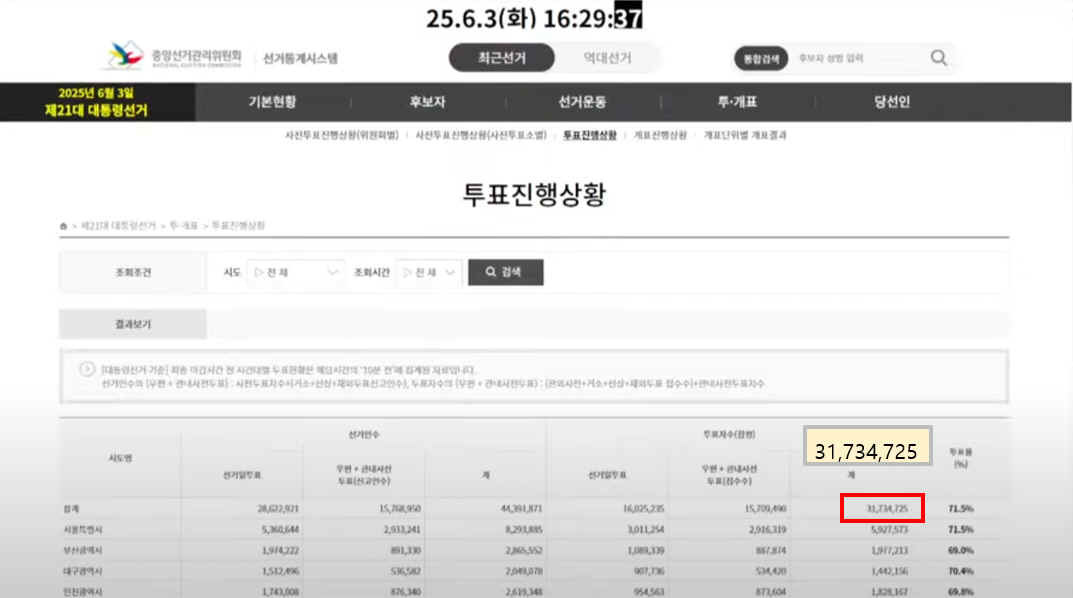 16시 29분 30분 가까이 투표수 증가 없이 투표율이 71.5% 유지