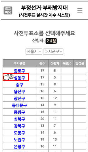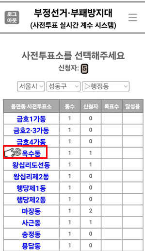사전투표소의 행정동을 선택합니다. 예) 옥수동
