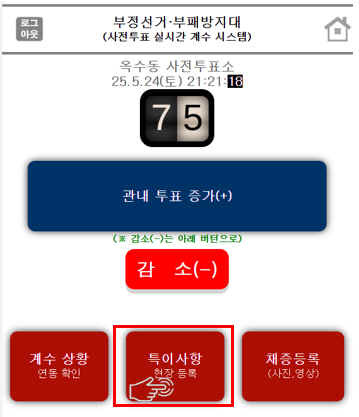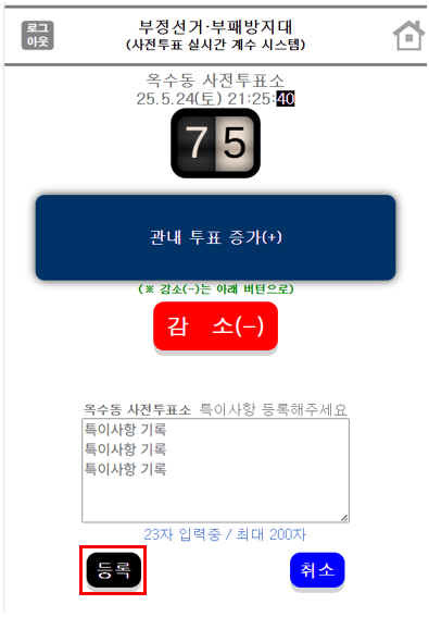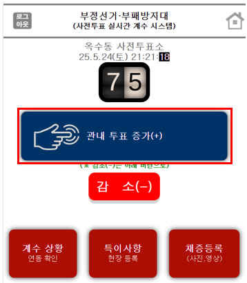 증가를 실제 투표자보다 많이 누른 경우 감소(-)를 누르면 숫자가 감소됩니다.