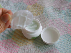 뚜껑을 열면 속 뚜껑이 있고 약간 푸른 빛을 띠는 크림이 들어있어요
