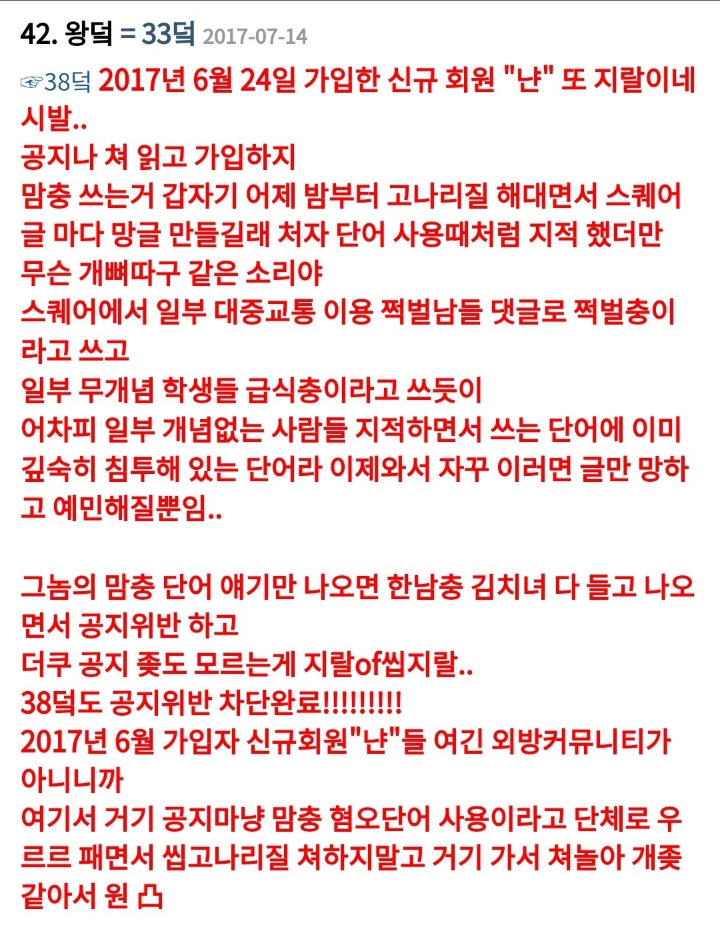 왕덬 말투 작성자⠀ |작성시간23.06.24|조회수759 목록 댓글 4 글자크기 작게가 글자크기 크게가 다음검색 현재 게시글 추가 기능 열기 북마크 신고 센터로 신고 댓글 댓글 4 댓글쓰기 답글쓰기 댓글 리스트 작성자. .. | 작성시간 23.06.24 ㅁㅊ 한남수준 작성자IIIIIlIIIllIIIIIII | 작성시간 23.06.24 왕덬이라 쓰고 한남이라 부르자... 작성자⠀⠀⠀⠀⠀⠀⠀⠀⠀⠀⠀⠀⠀⠀⠀ | 작성시간 23.06.24 아주 전형적인 한남이었네 작성자lllllllIll | 작성시간 23.06.24 벌금 시원하게 쳐맞아야 정신 차릴듯 댓글 전체보기