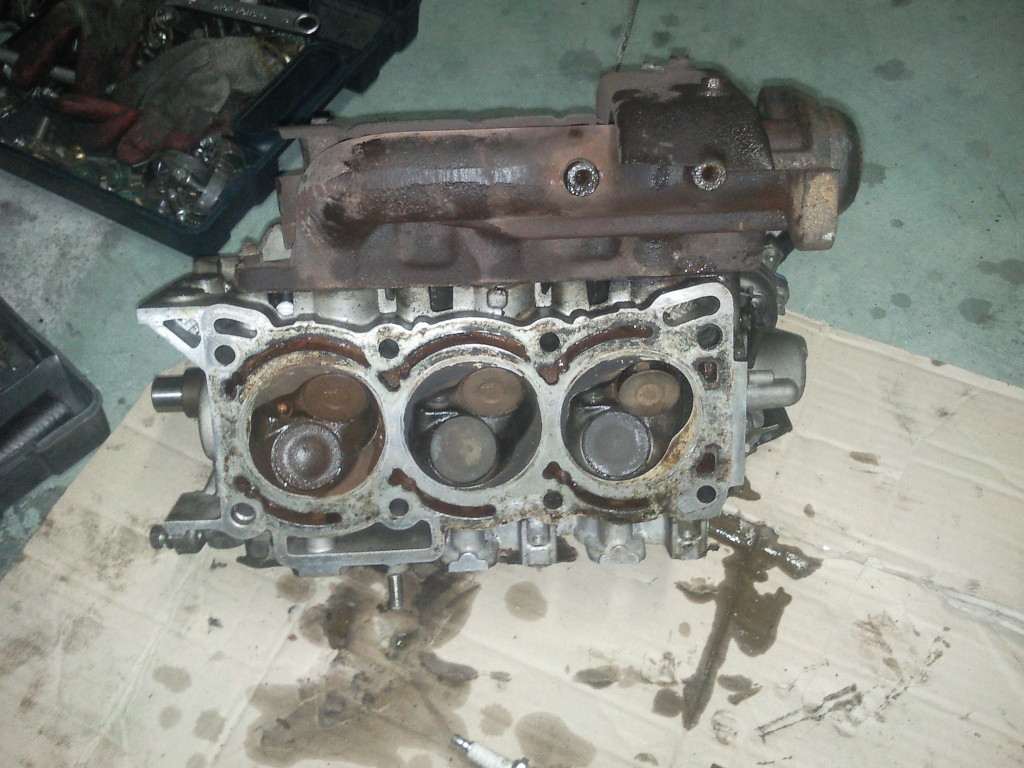 분리한 헤드입니다. 배기다기관은 붙인채로 촉매하고 연결부분만 풀면 됩니다. 이후에 사포로 헤드면 연마를 해줘야합니다. 너무 거친 사포는 안됩니다.
