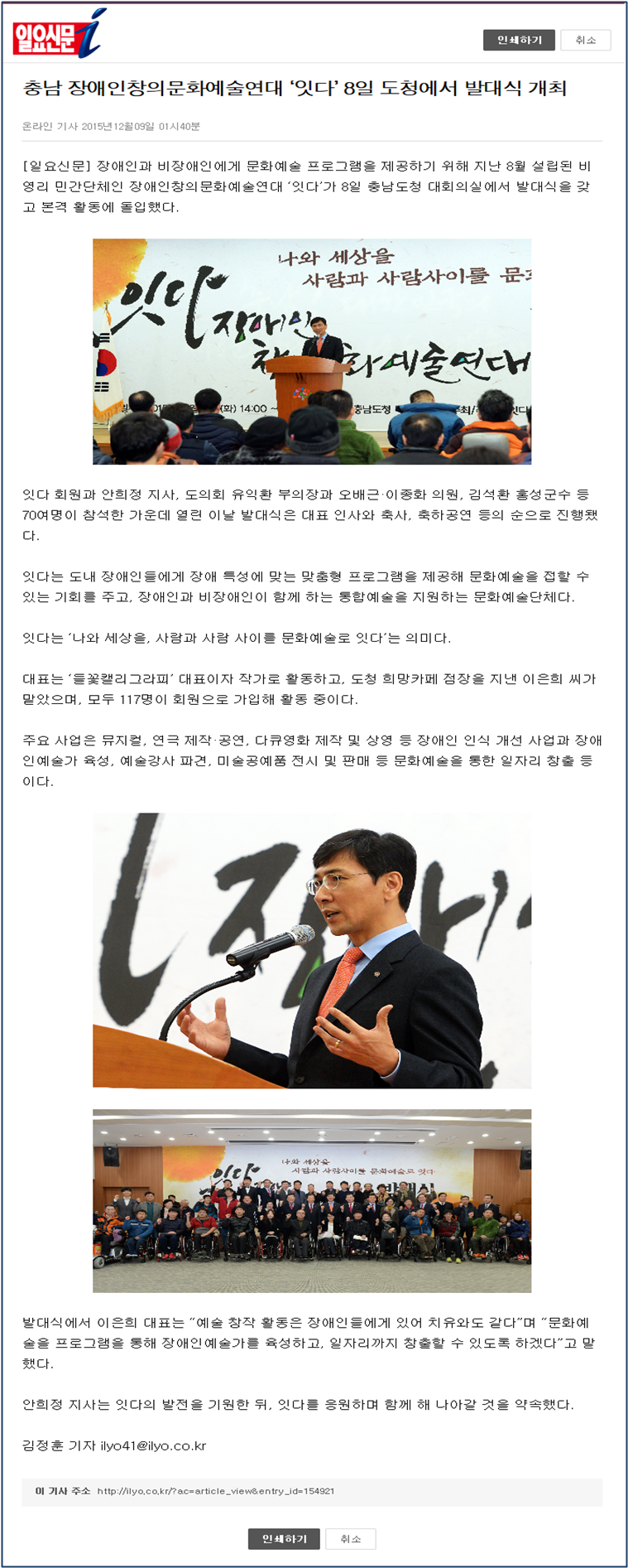 충남장애인창의문화예술연대 '잇다' 발대식 관련기사 01-일요신문.png