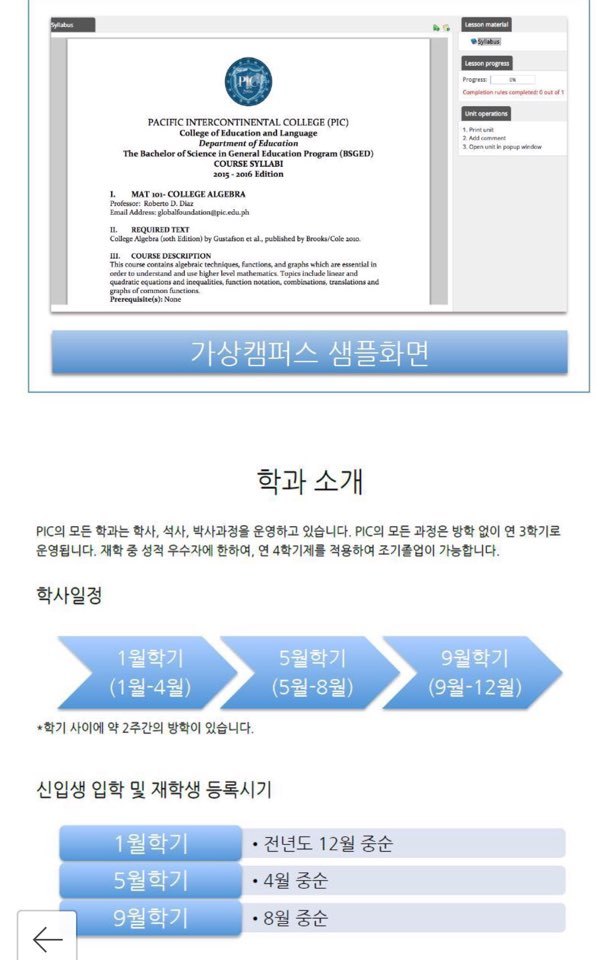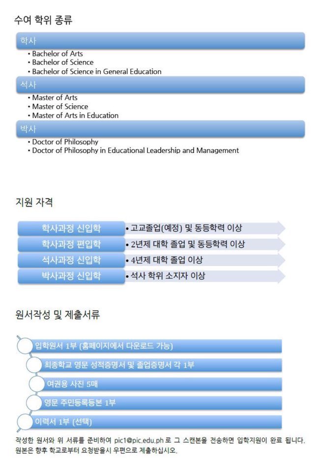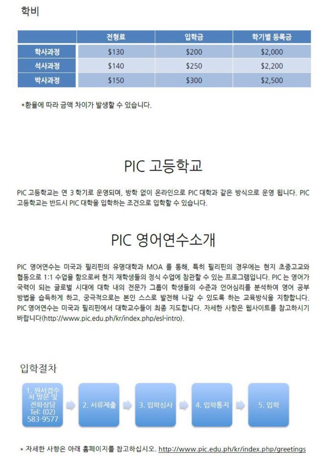 PIC 대학 (필리핀,미국) 공동학위대학 4월 모집요강 작성자신실|작성시간17.04.10|조회수90 목록 댓글 0 글자크기 작게가 글자크기 크게가 다음검색 현재 게시글 추가 기능 열기 북마크 공유하기 신고 센터로 신고 댓글 댓글 0 댓글쓰기 답글쓰기 댓글 리스트