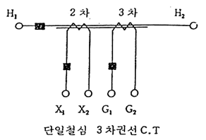 비접지 또는 고저항 접지계통에서 충분한 영상전류를 얻기 위하여 사용하고, 2차 권선에는 정상전류를 3차권선에서는 영상전류를 각각 얻을 수 있다. 따라서 고저항 접지계에서 1차전류가 300A(일본의 경우 400A) 이상인 CT에는 3차권선부로 하는 경우가 많다.(300A를 초과하는 경우에는 지락전류를 제한하기 위해 저항접지방식으로 하기 때문이다) |