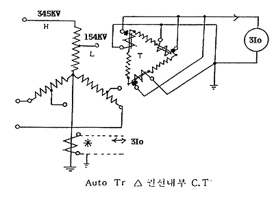 아래 그림은 Auto Trans의 Δ 결선 내부 CT를 이용하는 방법이다. Y 결선 Auto Trans나 Y-Y 결선 변압기에서는 사고의 위치에 따라 중성점 영상전류 방향은 변할 수가 있다. 따라서 이 경우는 중성점 영상전류 보다는 Δ 권선 내부 CT를 병렬 결선하여 방향요소계전기의 전류극성용 영상전류로 사용하여야 한다.
