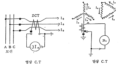 아래 그림은 영상 CT로부터 영상전류를 얻는 경우(3Io가 검출된다)와 중성점 접지개소에 단상 CT 1대를 사용하여 영상전류를 엊는 경우(3Io가 검출된다)이다.