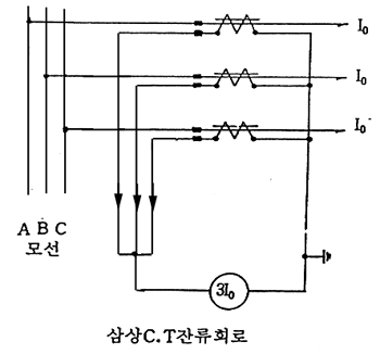 아래 그림은 3상 CT 잔류회로를 이용한 방법과 3차 권선부 CT에서 얻는 경우이며 Io가 검출된다.