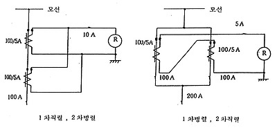아래 그림은 CT 두 대를 1차는 직렬, 2차는 병렬로 결선한 경우(종합변류비는 50/5로 변한다)와 100/5 CT 두 대를 1차는 병렬, 2차는 직렬로 결선한 경우이다. 종합변류비는 200/5로 변한다.