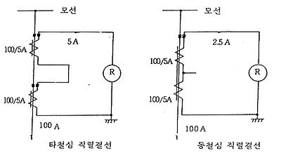 아래 그림은 100/5 CT 2대를 1차 및 2차권선 모두 직렬로 결선한 경우이다. 이때 종합변류비는 100/5 그대로 변하지 않고 포화특성만 개선된다. 여기서 CT 철심이 같은 경우는 다중비 CT가 되어 동철심직렬결선과 같이 종합 변류비는 200/5가 된다.