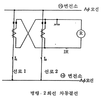 아래그림은 병행 2회선 차동결선이다. 그림에서와 같이 A상의 CT 2차회로를 차동결선하면 IR은 I1과 I2의 차전류를 얻을 수 있다. 즉, 평상시 부하상태에서는 CT 2차권선을 환류하는 전류만 있고 계전기전류 IR은 없다. 그러나 한 선로에서 사고가 발생하면 불평형 차전류 IR 이 발생하여 계전기는 감지할 수 있다. 이때에도 두 CT의 특성이 일치해야 한디.