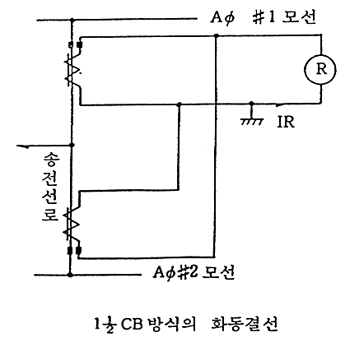 아래의 그림은 1½ CB 방식에서 선로전류를 얻기위한 화동결선이다. 그림에서 #1모선과 #2 모선 사이를 흐르는 전류는 CT를 통하여 환류하고 송전선로로 유출되는 전류만 계전기회로에 IR로 나타난다. 그림은 3상중 A상만 표시한 것이다.