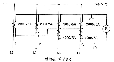아래 그림은 변형된 화동결선의 예이다. 그림에서 L3와 L4 선로의 CT 변류비는 4000/5이고 L1과 L2는 2000/5A 일 때 최대변류비에서 포화특성이 보자되기 때문에 변류비와 포화특성을 만족시키기 위해서는 변형된 화동결선이 필요하다.