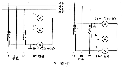 평형 3상 3선식 회로에서는 2대의 CT로 3상전류를 얻을 수 있는 방법으로 극성에 따라 0° 결선법과 180° 결선법 2가지가 있다.