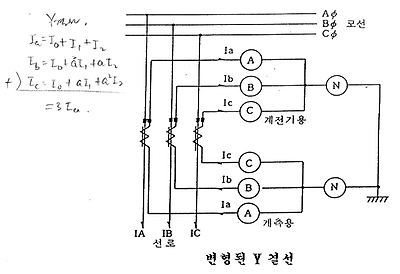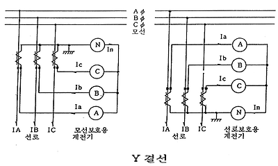 Y 결선은 CT회로의 기본결선이다. 그림에서와 같이 각 상마다 CT를 설치하여 한측은 Common하고 다른 한 측에서 정상전류를 얻어 사용한 후 다시 Common하여 잔류회로를 만들어 영상전류까지 얻을 수 있다.
