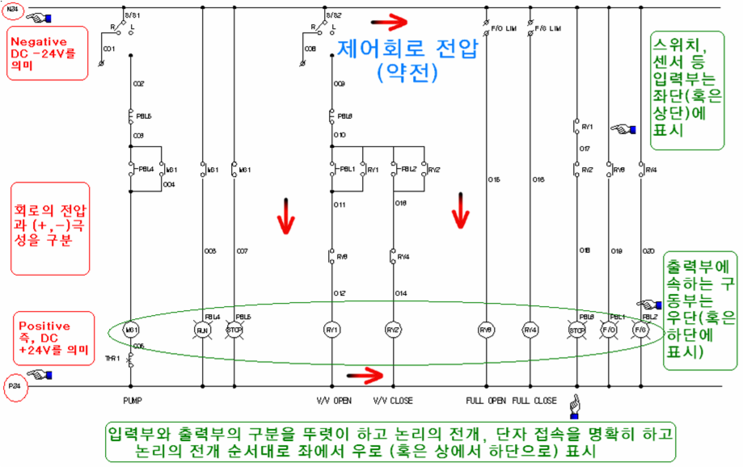 (1) 회로의 전압과 (+,-)극성을 우선 구분하고, 제어회로 전압(약 전)과