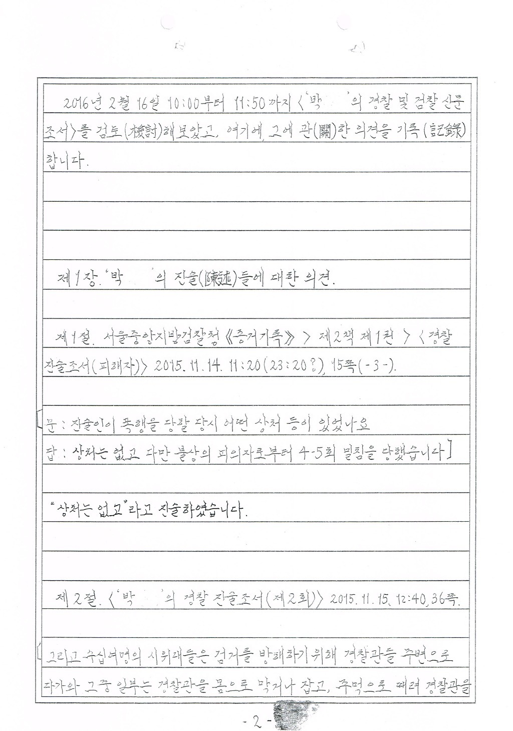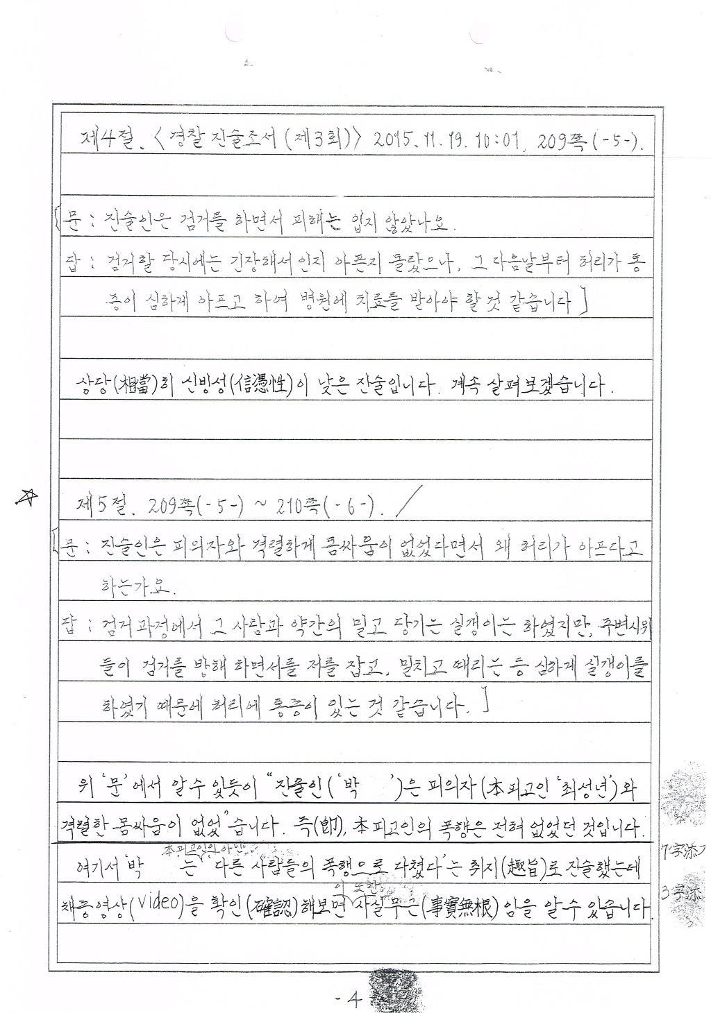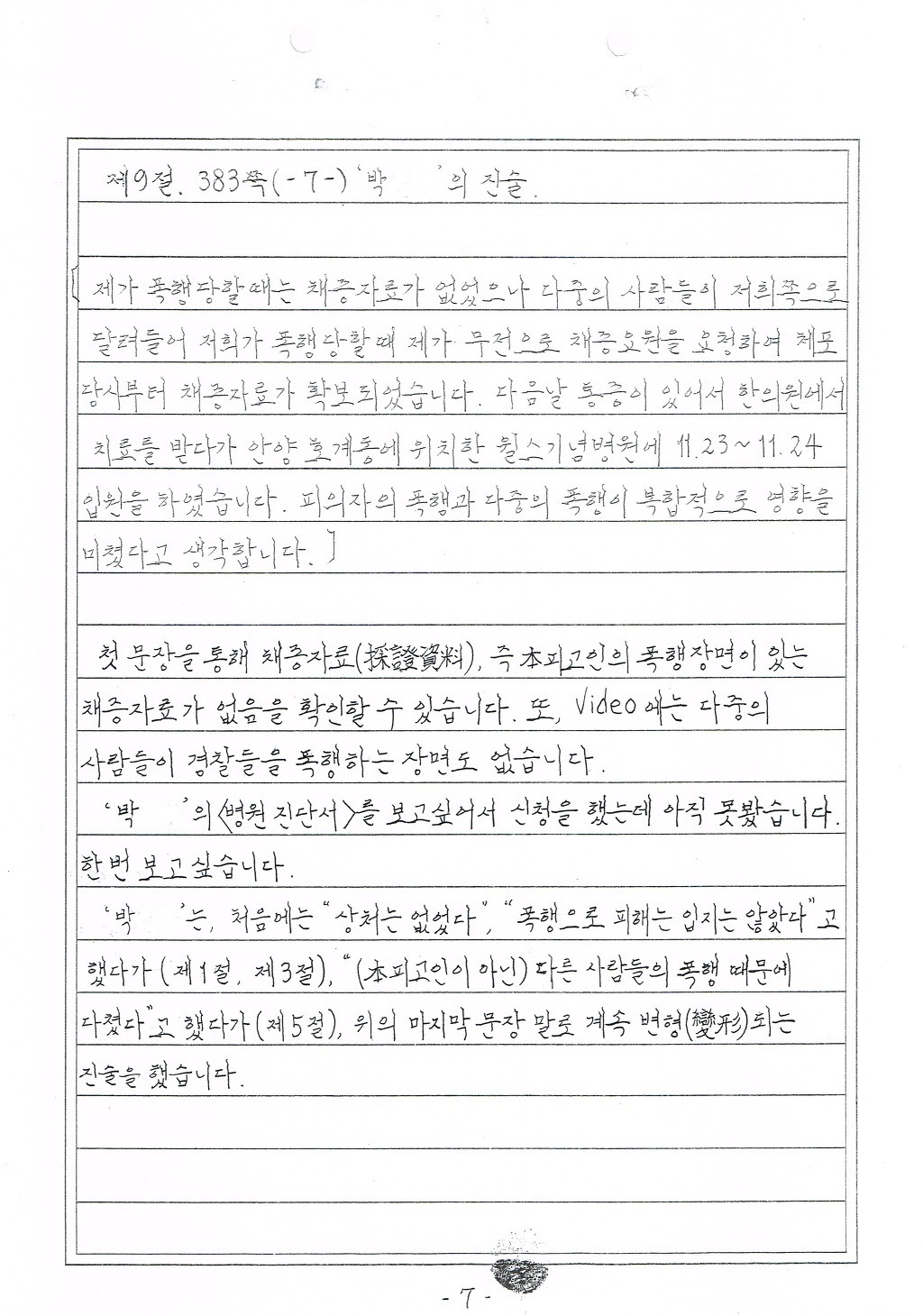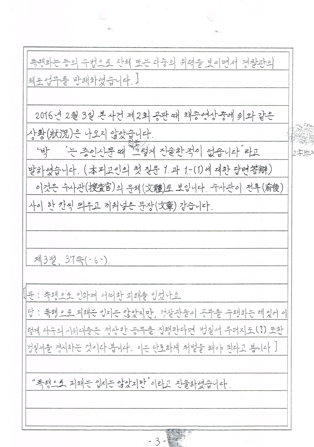 위 '문'에서 알 수 있듯이 "진술인('박○○')은 피의자(저)와 격렬한 몸싸움이 없었습니다. 즉, 저의 폭행은 전혀 없었던 것입니다. 여기서 '박○○'는 제가 아닌 다른사람들의 폭행으로 다쳤다'는 취지로 진술했는데, 채증영상(video)을 확인해보면 이 또한 사실무근임을 알 수 있습니다.