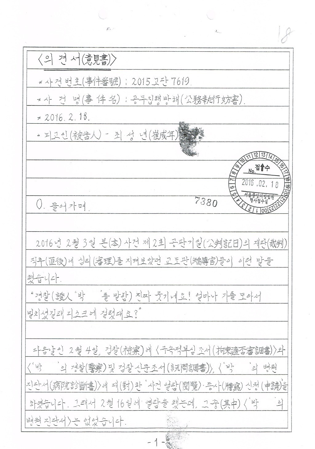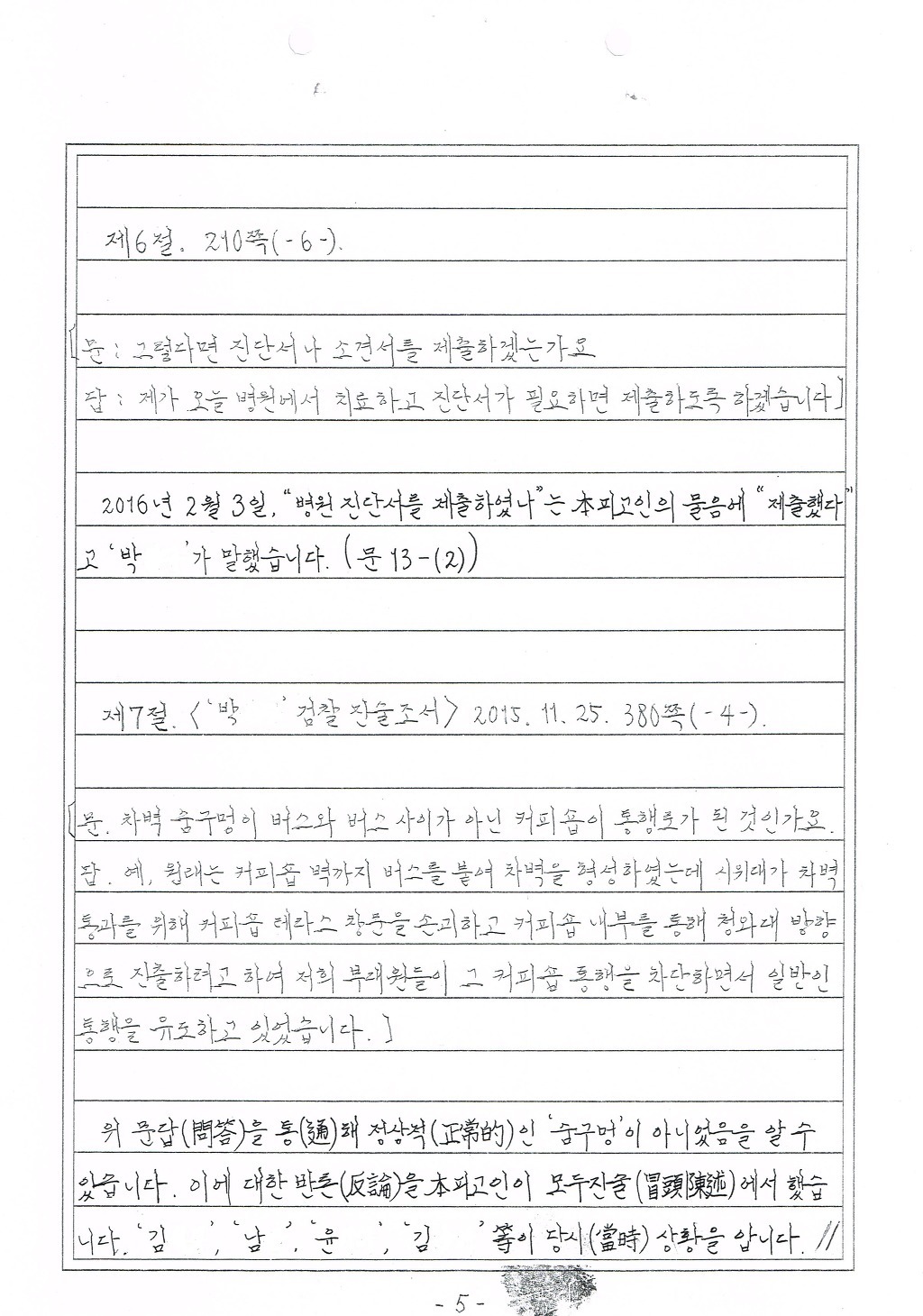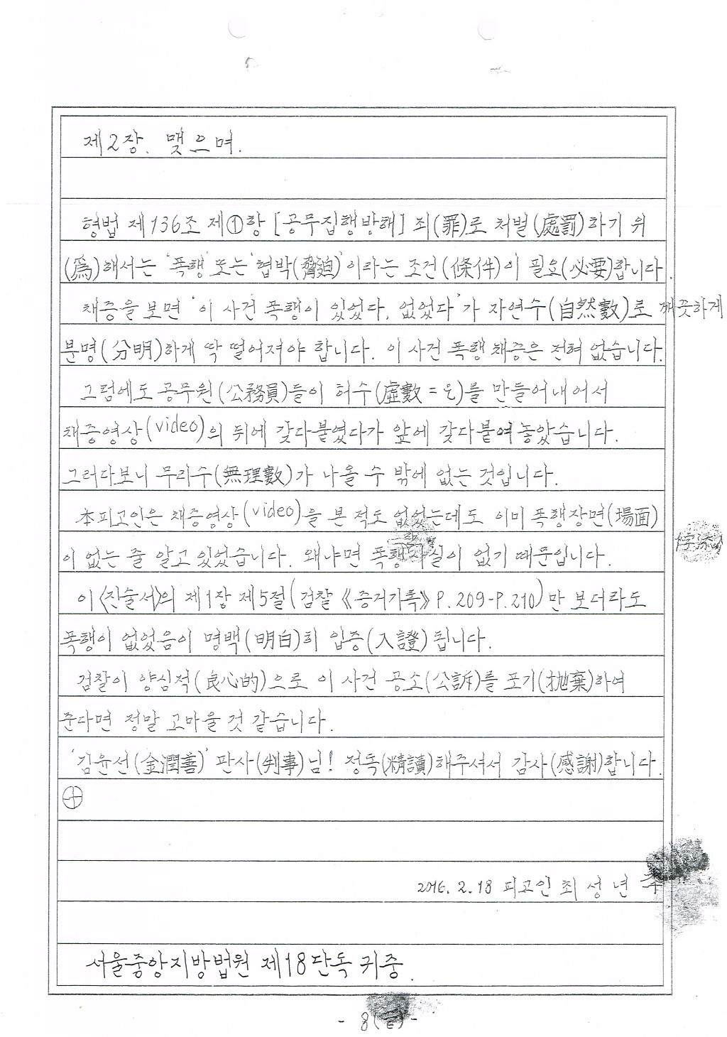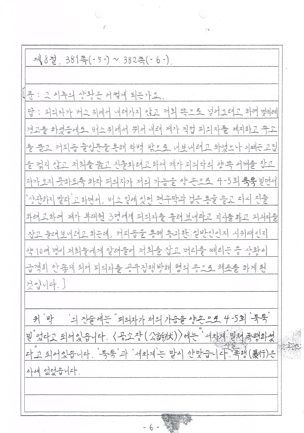 위 '문'에서 알 수 있듯이 "진술인('박○○')은 피의자(저)와 격렬한 몸싸움이 없었습니다. 즉, 저의 폭행은 전혀 없었던 것입니다. 여기서 '박○○'는 제가 아닌 다른사람들의 폭행으로 다쳤다'는 취지로 진술했는데, 채증영상(video)을 확인해보면 이 또한 사실무근임을 알 수 있습니다.