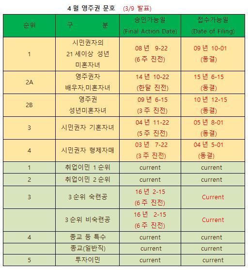 가족이민에선 유일하게 영주권을 최종 승인 받을 수 있는 승인가능일만 모든 순위에서 전달보다 1주~6주씩 진전되었습니다.