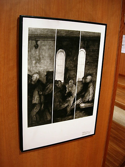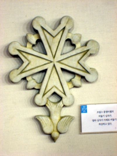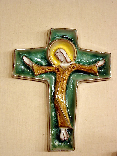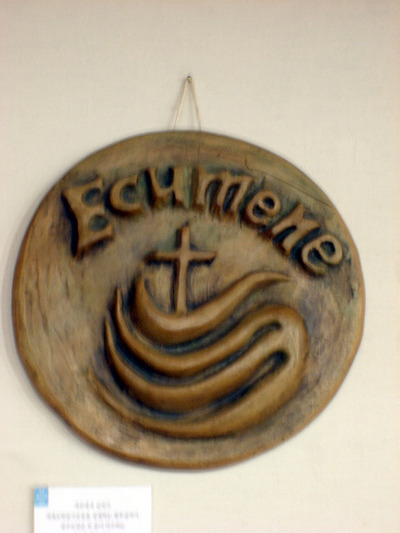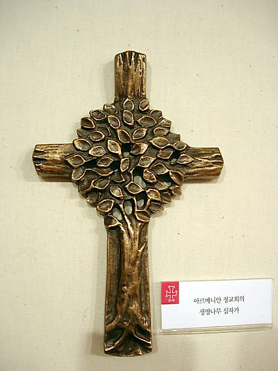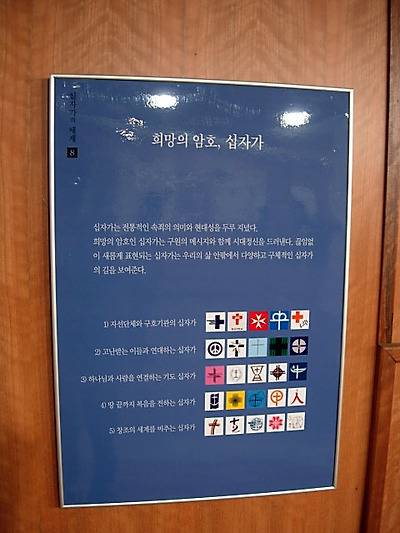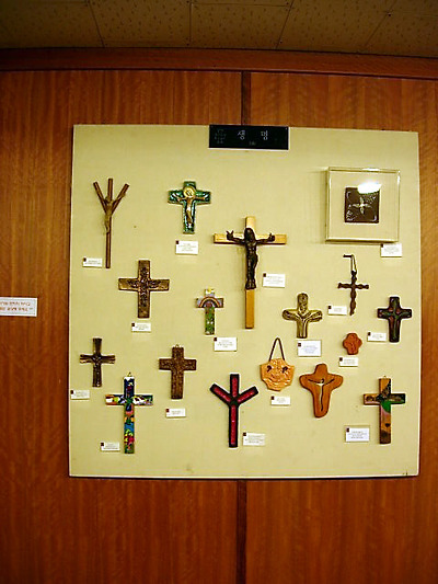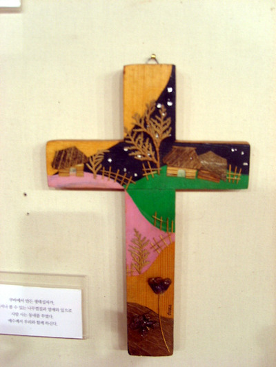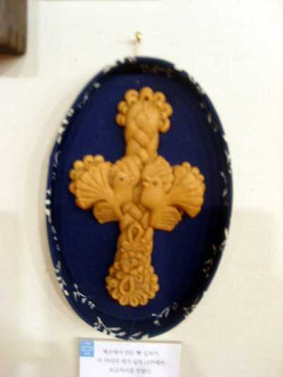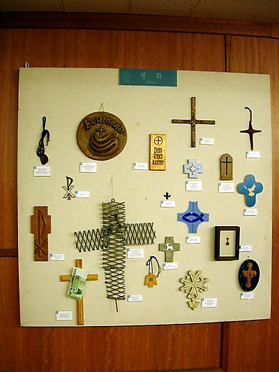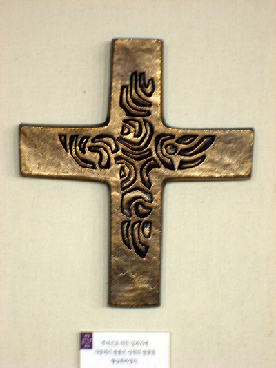 1995 남북 교회 희년 기념 십자가, 이철수 판화를 부조한 것으로 열십자 모양의 민들레 홀씨 5개가 한반도를 날고 있다.