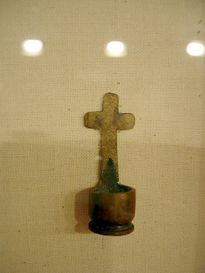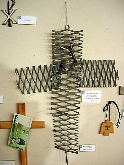 탄피를 자르고 펼쳐서 십자형 성수함으로 재 구성하였다.