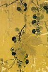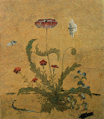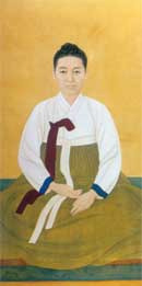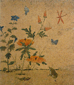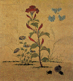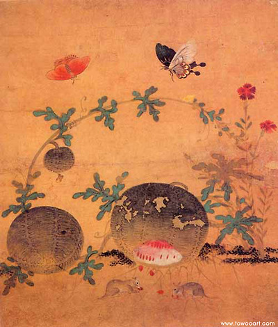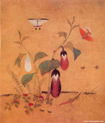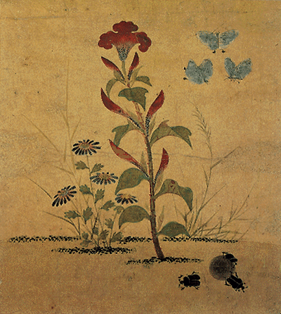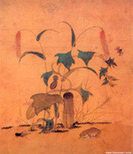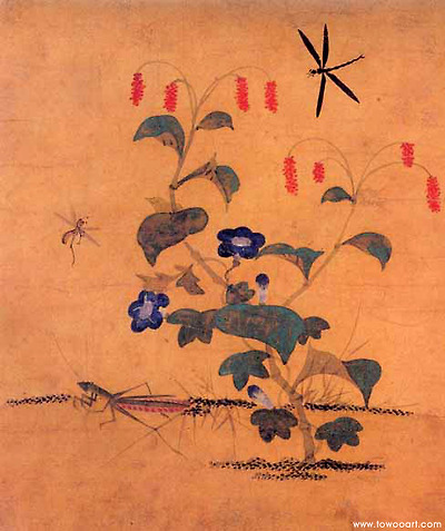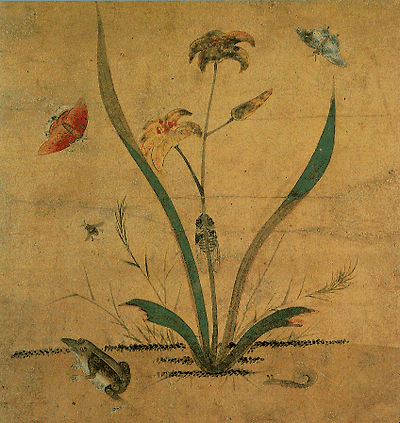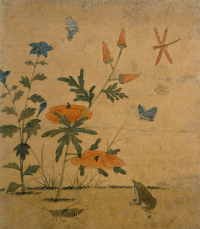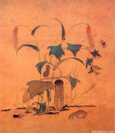 어숭이와 개구리 (설명) 신사임당의 〈초충도〉는 비슷한 구도의 초충이 그려진 여덟 폭의 병풍인데, 현재는 열 폭으로 꾸며져 있다. 그림이 아닌 나머지 두 면에는 {G:신경}과 {G:오세창}의 발문(跋文)이 적혀 있다. 각 폭마다 화면의 중앙에 두 세 가지의 식물을 그린 다음에, 그 주변에 흔히 볼 수 있는 각종 풀벌레를 적당히 배치하여 좌우 균형과 변화를 꾀하였다. 이 〈초충도〉는 형태가 단순하고 간결하여 규방(閨房)의 여성들이 필수적으로 하던 자수(刺繡)를 위한 밑그림이 아닌가도 생각된다. 여러 가지 청초한 식물과 풀벌레를 실물에 가깝게 정확하게 묘사하면서도, 섬세하고 선명한 필선으로 묘사하여 여성 특유의 청초하고 산뜻한 분위기가 돋보인다.