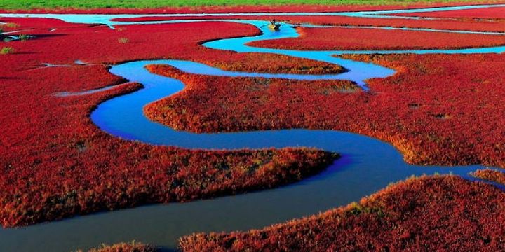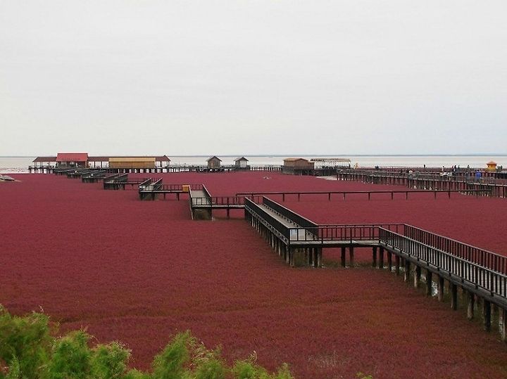 중국 판진에 위치해 와인처럼 온통 붉게 물든 해변은 자연의 경이로운 광경에 세계에서 가장 아름다운 명소로 손꼽힌다. 붉은 색 식물은 봄에는 초록빛을 띄고 있지만 가을이면 고즈넉한 분위기답게 온통 붉은색으로 변한다.