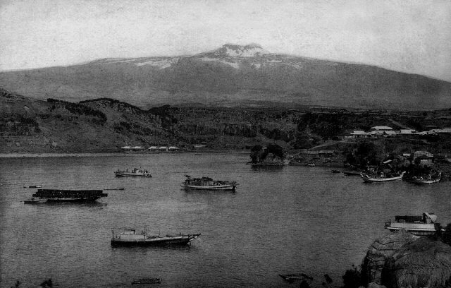 일제 강점기에 촬영된 것으로 추정되는 서귀포항과 한라산.