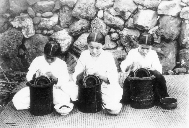 가르마를 반듯하게 탄 제주 소녀들이 담벼락 앞 멍석에 앉아 망건은 겯고 있다.