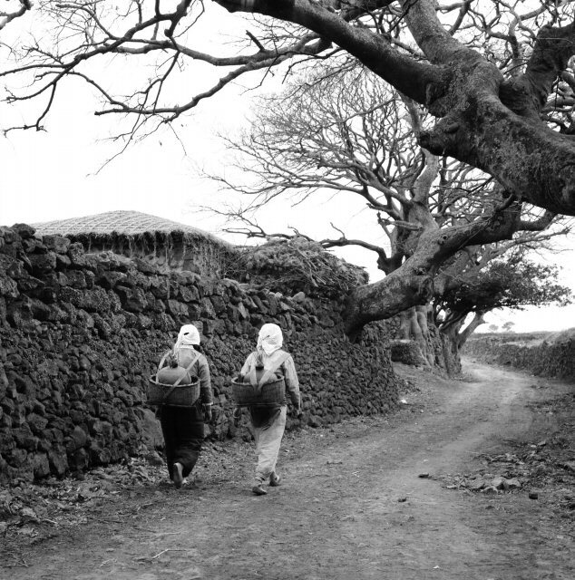 오줌허벅 진 아낙네 = 1970년대 제주시 애월읍 하가리에서 오줌허벅을 진 아낙네들이