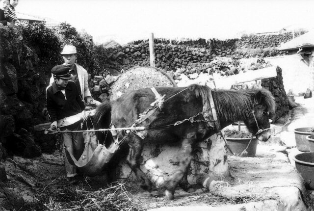 =제주에서 말을 이용해 아버지와 아들이 연자방아 돌리고 있는모습.