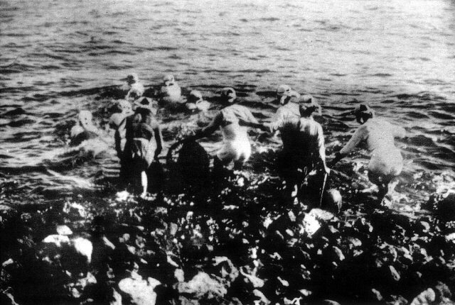 1930년대 제주 해녀 = 1930년대 해녀들이 물질을 하기 위해 바다에 들어가고 있다.
