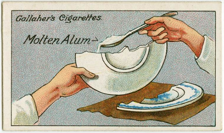 그럼 먼저 철제 숟가락에 명반가루를 가열하여 녹여줍니다. 그런 다음 깨진 조각에 발라주고 굳어서 제 위치를 잘 잡을 때까지 잡고 있으면 복원이 완성된다고 합니다.