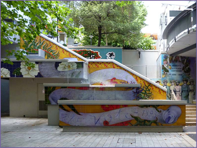 Albert Park 공원으로 올라가는 계단에는 뉴질랜드 여성 투표권 쟁취를 기념하는 벽화가 보인다