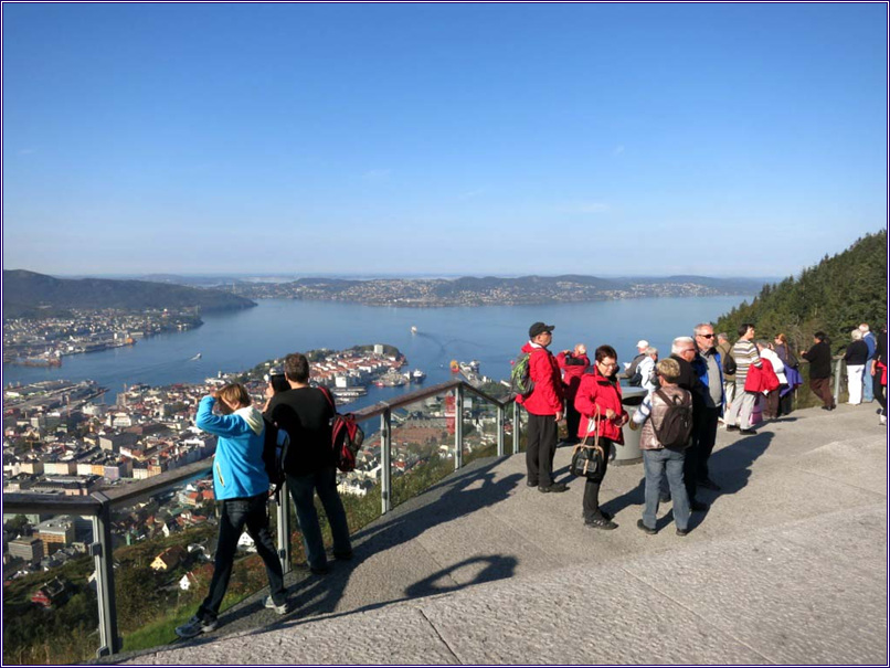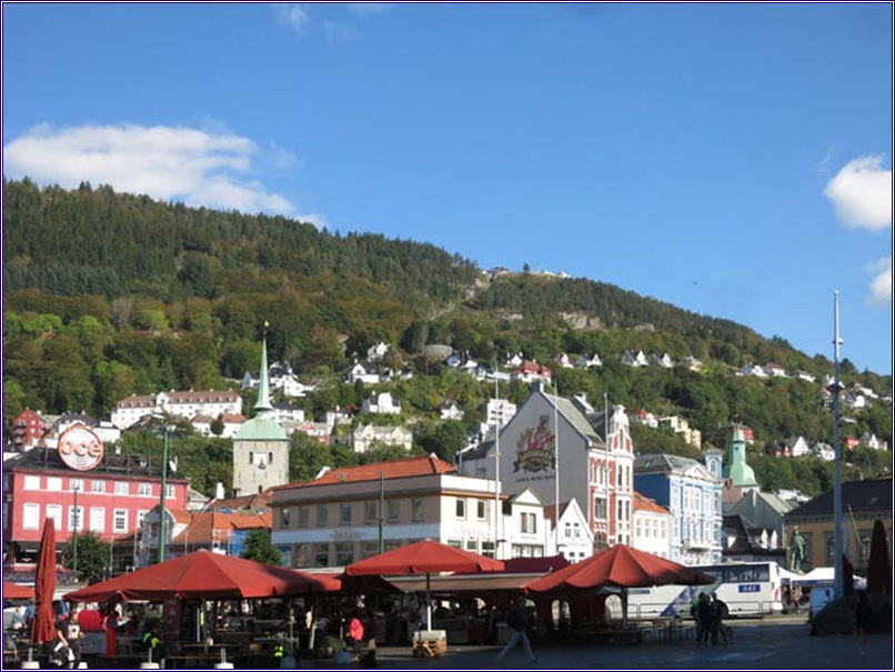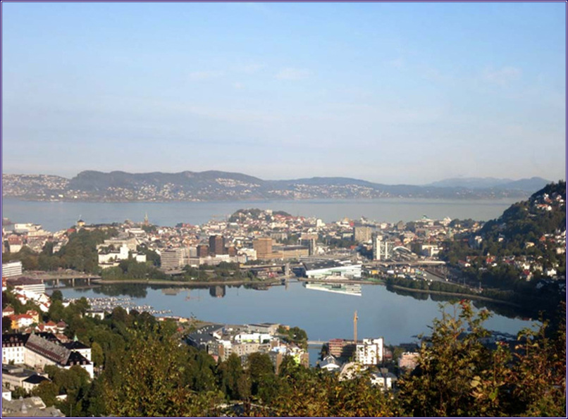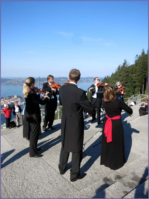 시내에 도착해서 처음 간 곳은 funicular를 (강삭철도?) 타고 올라가는 산 정상이었는데 산 정상에서 내려다보이는 경치가 일품이었다. 산 정상에는 카페도 있고 가끔 정장을 한 연주가들이 클래식 음악연주도 하고 근처 산길로 산책도 할 수 있고 등등, 하루 종일을 보낼 수도 있는 곳이었다. Funicular는 Bergen Card를 가지면 무료인 줄 알았는데 12일 후인 10월 1일부터 무료여서 우리는 50% 할인만 받았다.