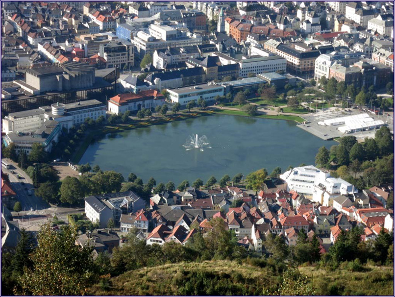 Mt. Floyen 산에서 내려다보이는 조그만 호수 Lille Lungegardvannet 가에는 조그만 공원도 보인다